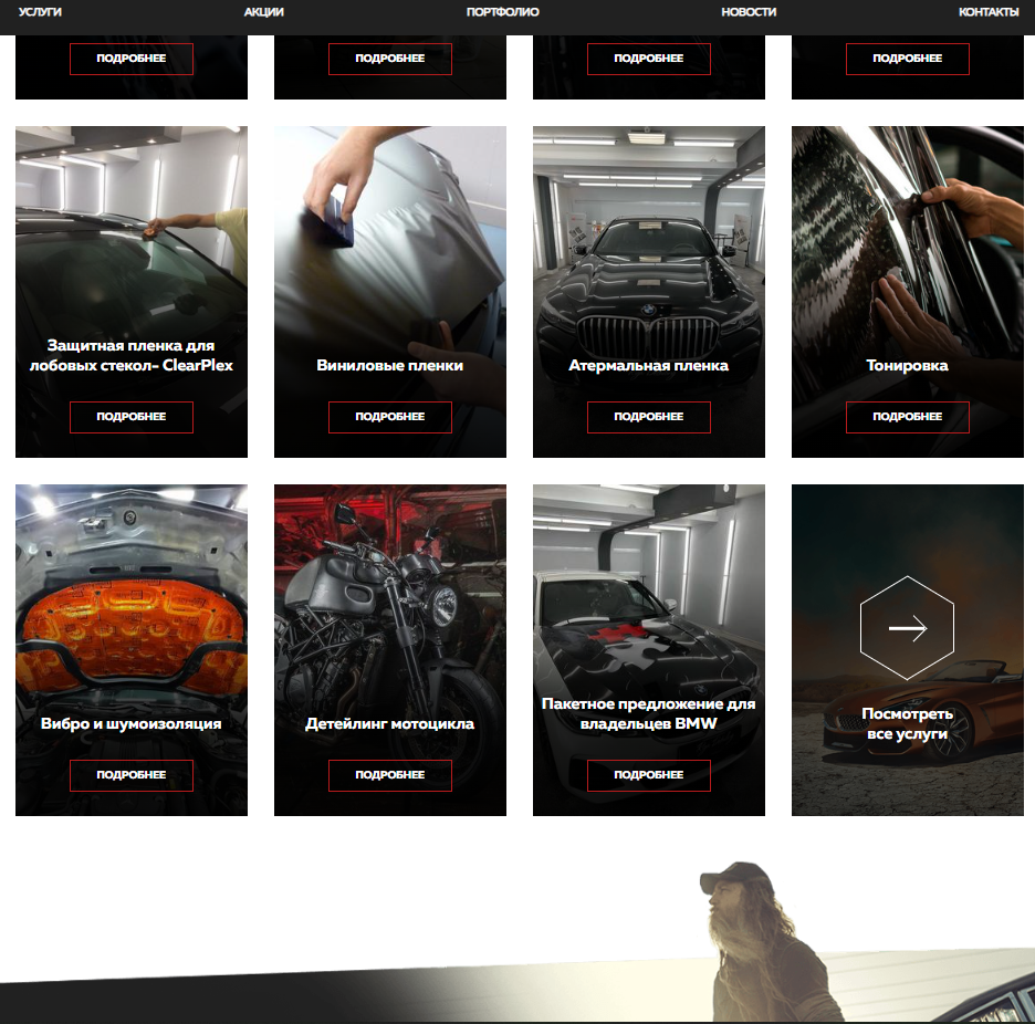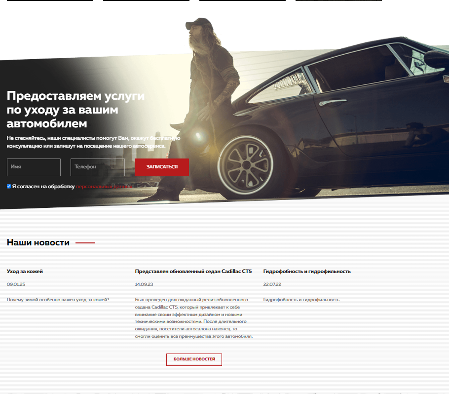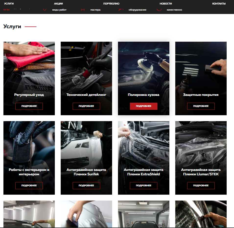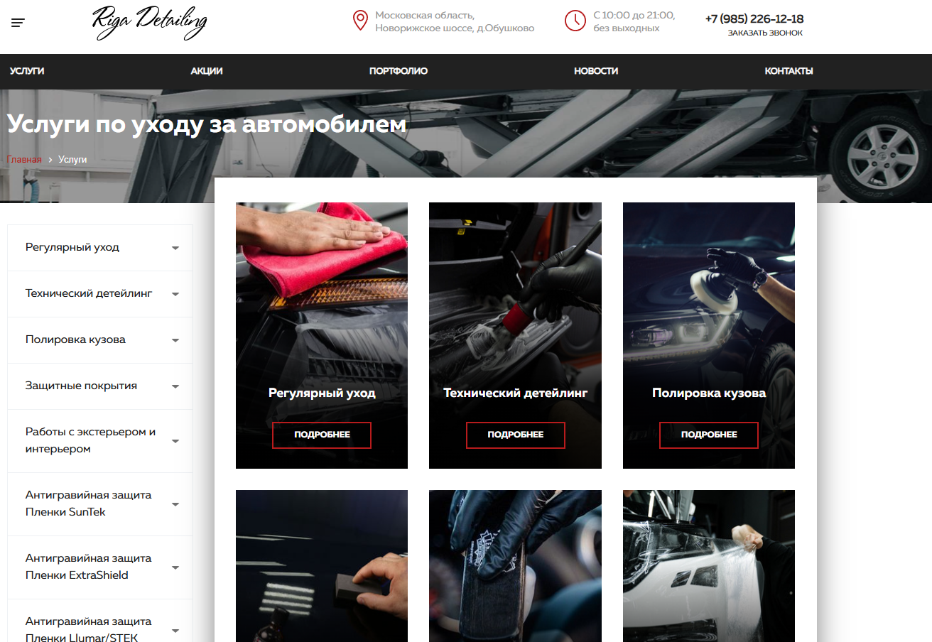 Создать современный сайт, который продемонстрирует услуги и его особенности детейлинга, а также покажет компанию. Кроме того, стояла задача с помощью удобного сайта и его комплексного продвижения привлечь новых клиентов и увеличить продажи.