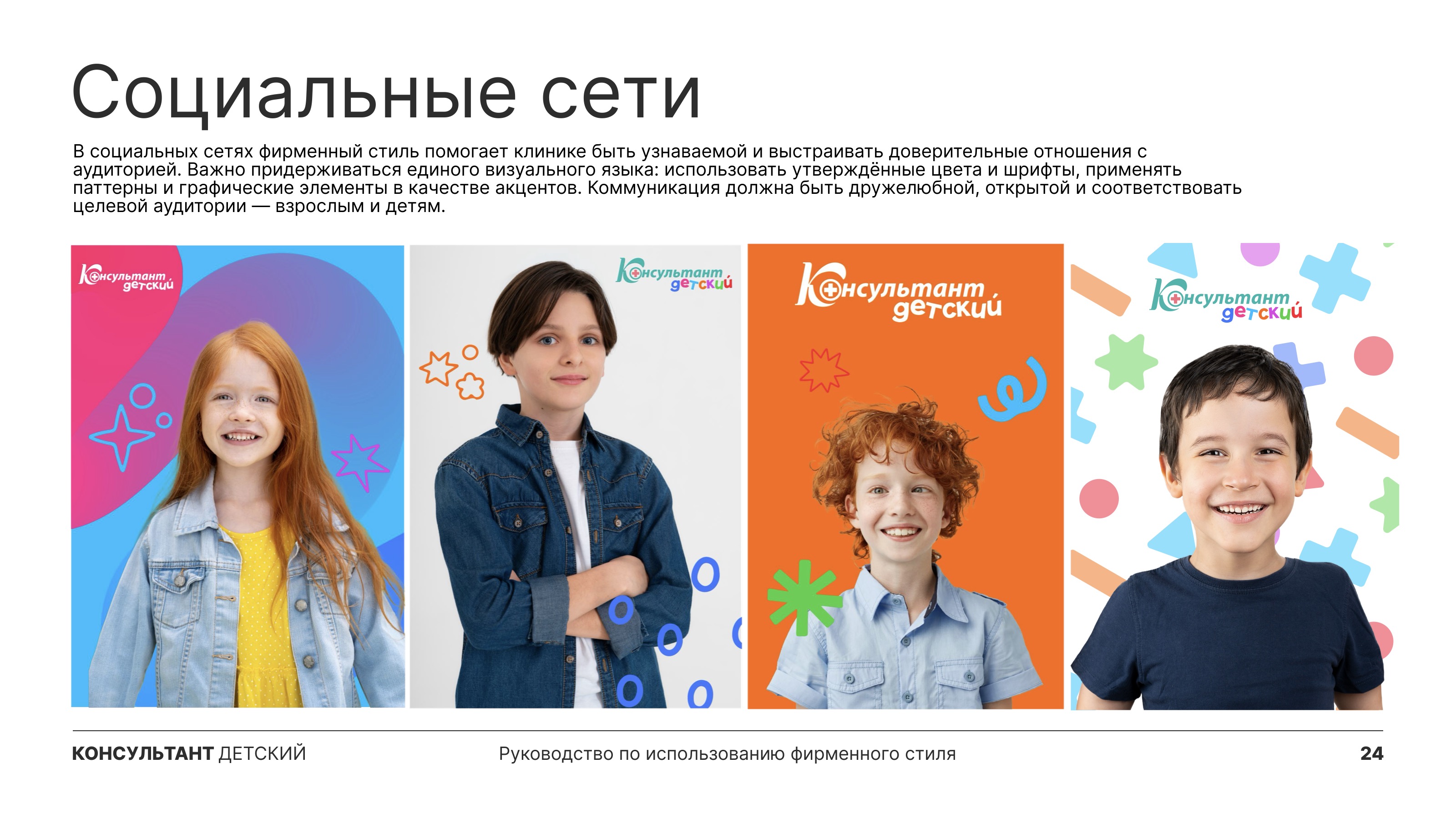 Создали уникальный брендбук для детского отделения клиники «Консультант»: разработали логотип, выбрали приятные детские цвета, создали декоративные элементы и стандарты фотосъемки. Получился стильный и теплый фирменный стиль, улучшающий восприятие клиники пациентами.
