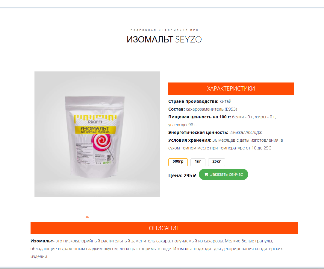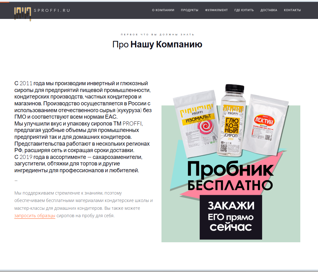 Сайт для пищевой промышленности. "С 2011 года мы производим инвертный и глюкозный сиропы для предприятий пищевой промышленности, кондитерских производств, частных кондитеров и магазинов. Производство осуществляется в России с использованием отечественного сырья (кукуруза) без ГМО и соответствуют всем нормам ЕАС."